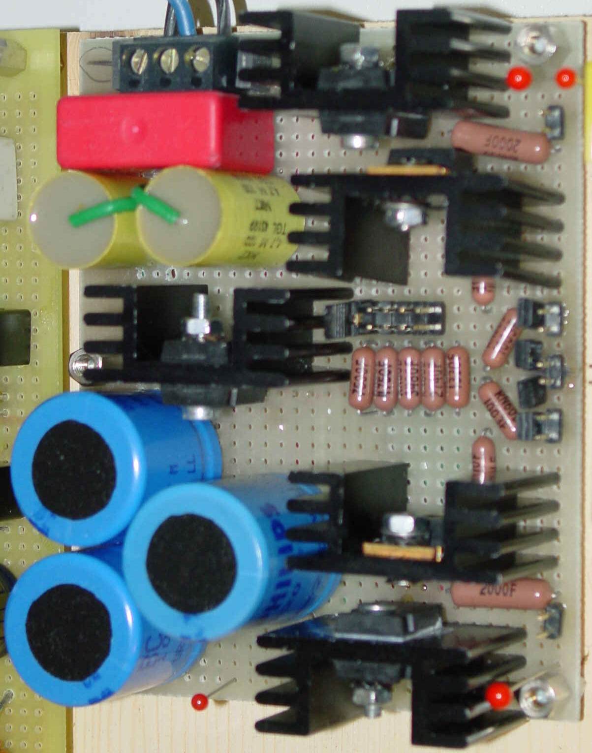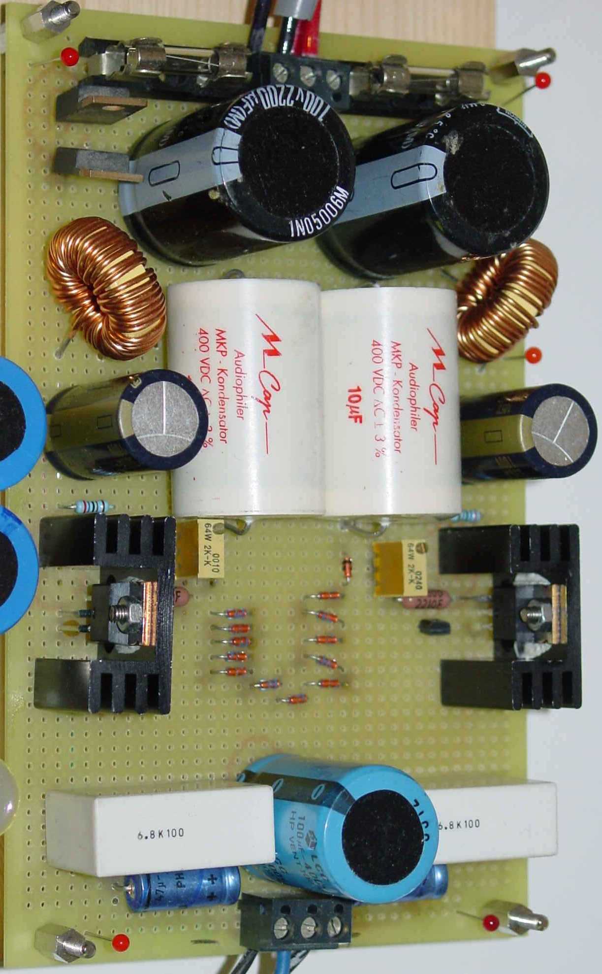Optimiert habe ich die Spannungsstabilisierung und Filterung mit MKT und größeren Elkos auf der Platine.